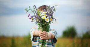 Little kid boy in meadow bouquet of flowers at the countryside.